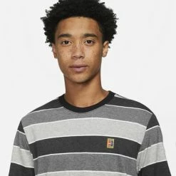 This NikeCourt Striped T-Shirt is made from 100% cotton making it extremely soft and breathable, a perfect choice for warmer days on the court. Colour: Grey Product Details Crew neck with internal taping Longer rear hem for extra coverage NikeCourt stitched logo Regular fit Fabric: 100% cotton