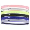 Minimise your distractions during important playtime with these Nike headbands. This 3 pack comes with three different vibrant tones with a funky metallic design so you can have one for every occasion. Colour: Pink / Purple Product Details Stretch construction for a customised fit Nike print design for trademark style Machine washable Pack of 3 Fabric: 60% rubber / 40% polyester
