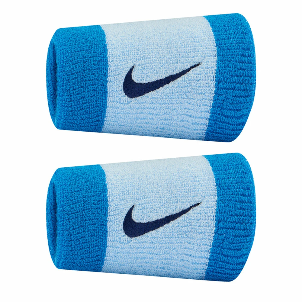 The Nike Swoosh doublewide wristband is made from an absorbent cotton/nylon/spandex blend with embroidered Nike Swoosh. 2 per pack. 5 inch.