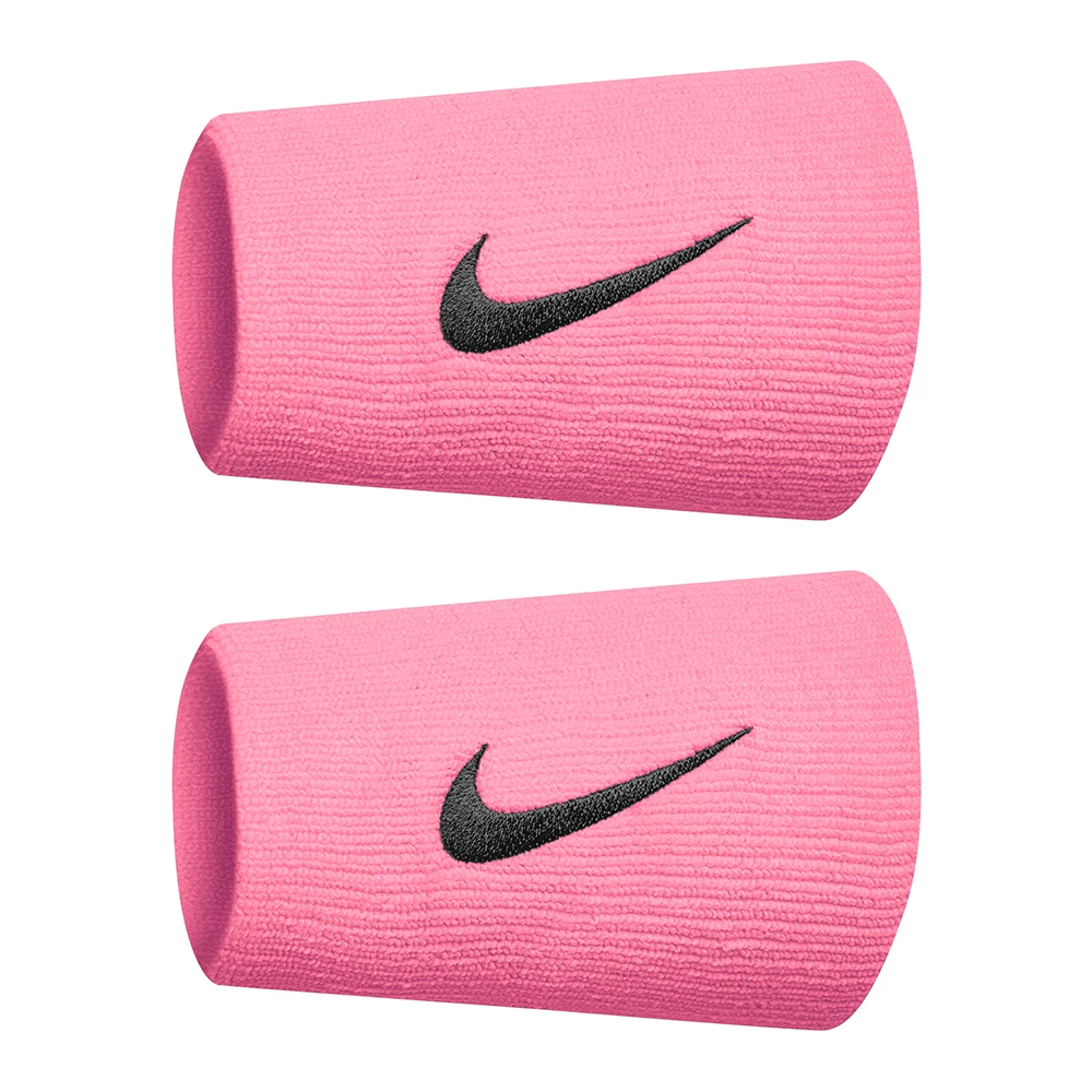 The Nike Swoosh doublewide wristband is made from an absorbent cotton/nylon/spandex blend with embroidered Nike Swoosh. 2 per pack. 5 inch.