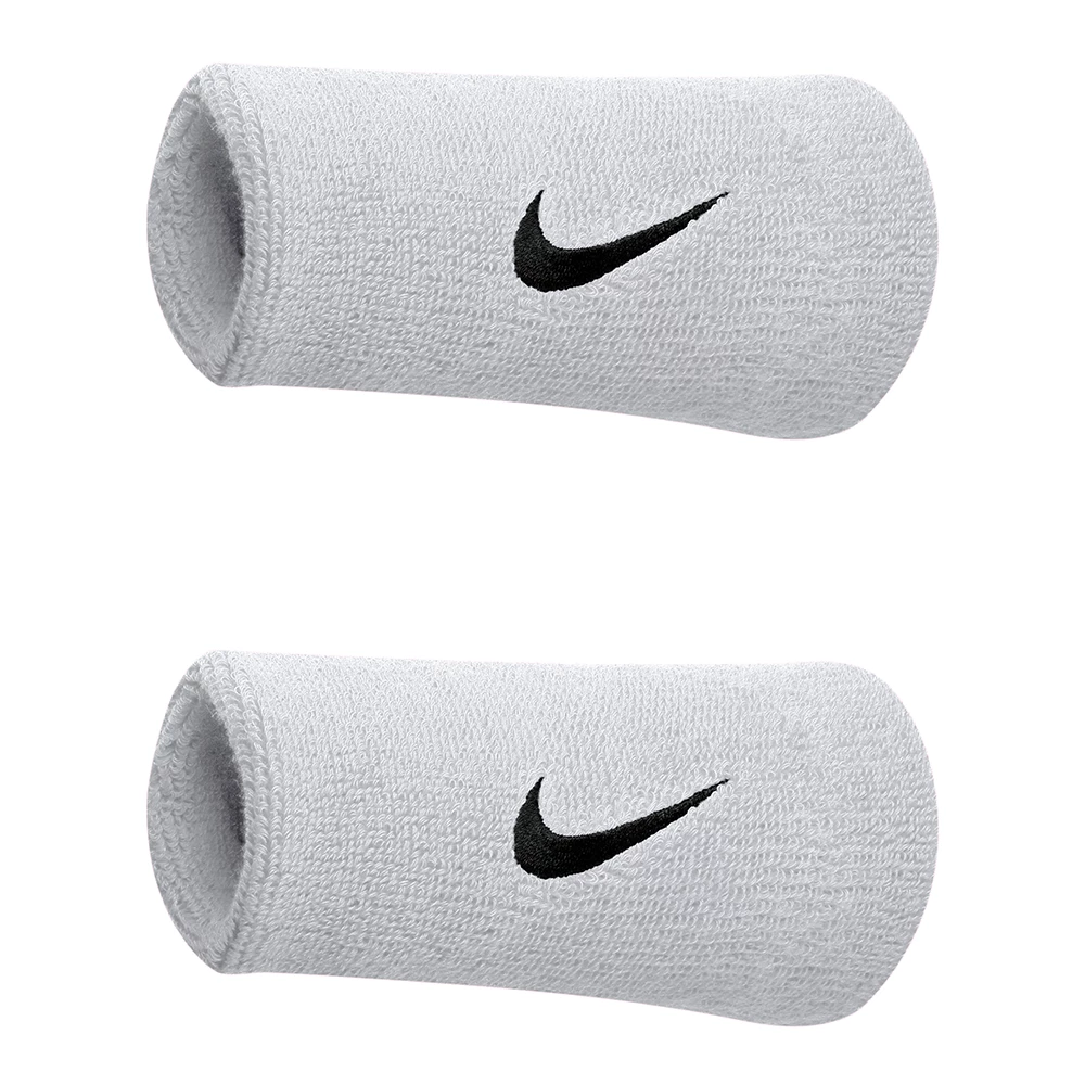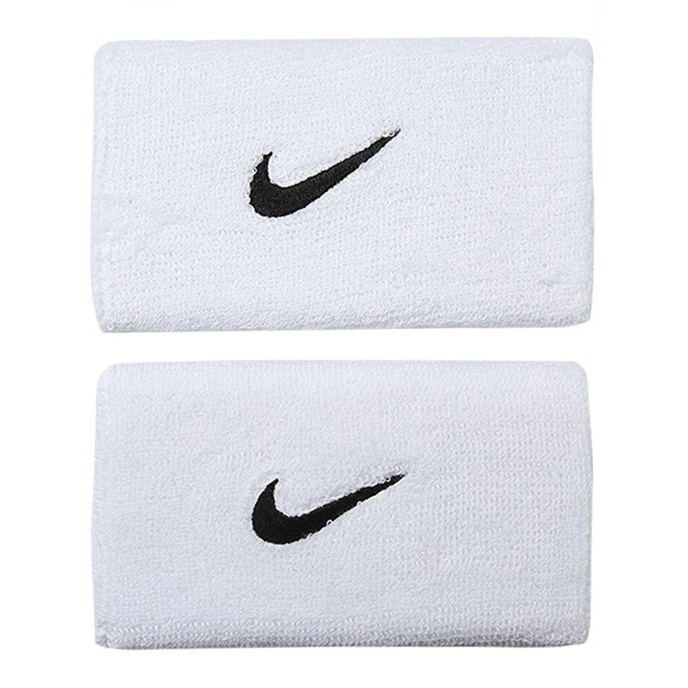 The Nike Swoosh doublewide wristband is made from an absorbent cotton/nylon/spandex blend with embroidered Nike Swoosh. 2 per pack. 5 inch.