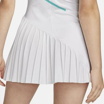 Dominate the court in style in this Nike Court Dress. Inspired by Nike’s classic chevron designs, this dress has asymmetrical neckline, strips of mesh, taping and pleats. The stretchy knit fabric of the body is paired with a woven pleated hem for functional style. This dress also features a special Swoosh with the original design outlined over the current version. Colour: White / Washed Teal / Wolf Grey Product Details Dri-FIT Advantage combines moisture-wicking fabric with a stretchy feel Made with at least 50% recycled fibres Asymmetrical pleats made from stretch woven material Fabric: 79% polyester / 21% spandex