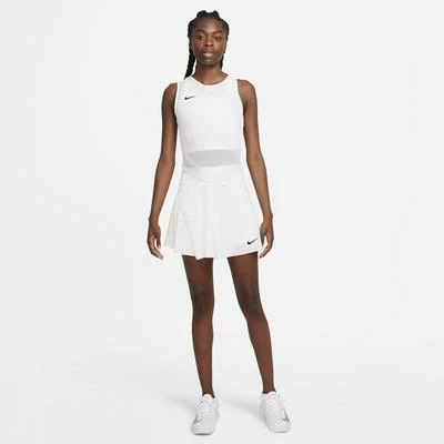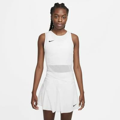 Fashionable tennis tank made for Nike Pro’s competing at the Grand Slam in Paris. Crafted with our most innovative materials, the NikeCourt Dri-FIT ADV Slam Tank is designed to perform at the highest levels of play. The cutting-edge design pairs the lightweight mobility of a moisture-wicking crop top with the coverage and breathability of sheer mesh. The result is a statement-making tank that will keep you cool and comfortable. This product is made from at least 50% recycled polyester fibres. Colour: White / Black Product Details Advanced Material - Nike Dri-FIT ADV technology combines moisture-wicking fabric with advanced engineering and features to help you stay dry and comfortable. The material closest to your body is lightweight and subtly iridescent so it seems to change colour while you move. Insightful Design - Super stretchy, the fabric on the inner tank is innovated to increase breathability and reduce cling. Its slightly textured design is subtly iridescent so you’ll stand out on the court. The tank is cropped so it sits at your waist. Breathable Overlay - A sheer, asymmetrical mesh overlay adds coverage without affecting breathability and stretch. Darts on one side add shape and sophistication to your look. Racerback Slim fit for a tailored feel Body: 93% polyester/7% elastane. Underlay: 89% polyester/11% elastane. Machine wash
